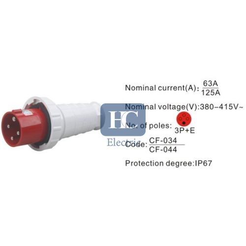 P44 & IP67 splashproof and waterproof industrial plugs are also available. Single phase and 3 phase multiple poles available: 3 pins (2p+e), 4 pins (3p+e), 5 pins (4p+e). The earth position can be 4h or 6h. Three voltage categories are optional: 110V-130V, 220V-250V, 380V-415V. Four standard ampere specifications are supplied: 16A, 32A, 63A, and 125A.