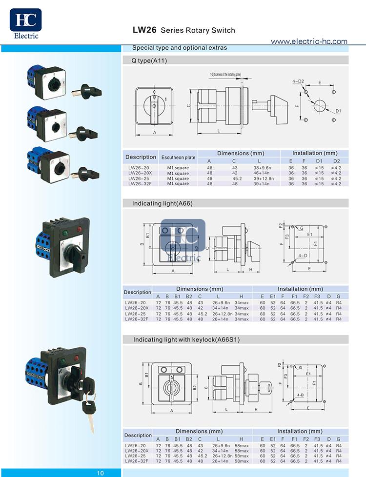 The LW26 series rotary cam switch mainly applies to below AC 440V,or below 240V DC, rated current up to 315A circuits. It is applied for unfrequent connecting or disconnecting circuits working as controlling or changeover function. It can be also used to control three phase asynchronous motor or as command control or for circuit measuring like Voltmeter or Ammeter. It has wide applications such as circuit controlling, testing equipment, motor controlling, command controlling and electric welding controlling.